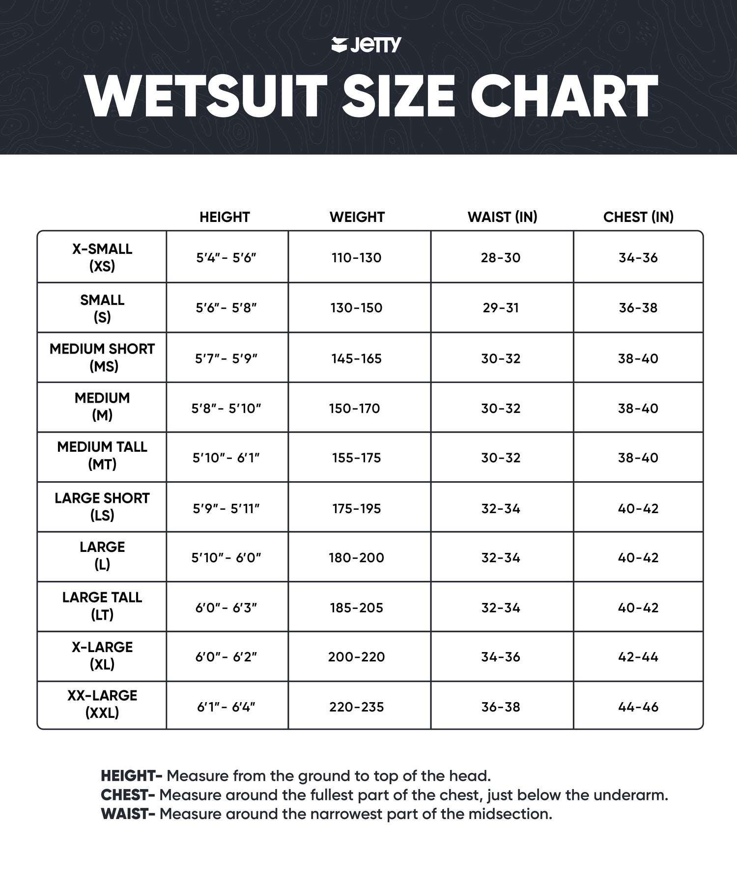 Chest - Measure around the widest/fullest area of your chest, an inch below your armpits, keeping the measuring tape horizontal.